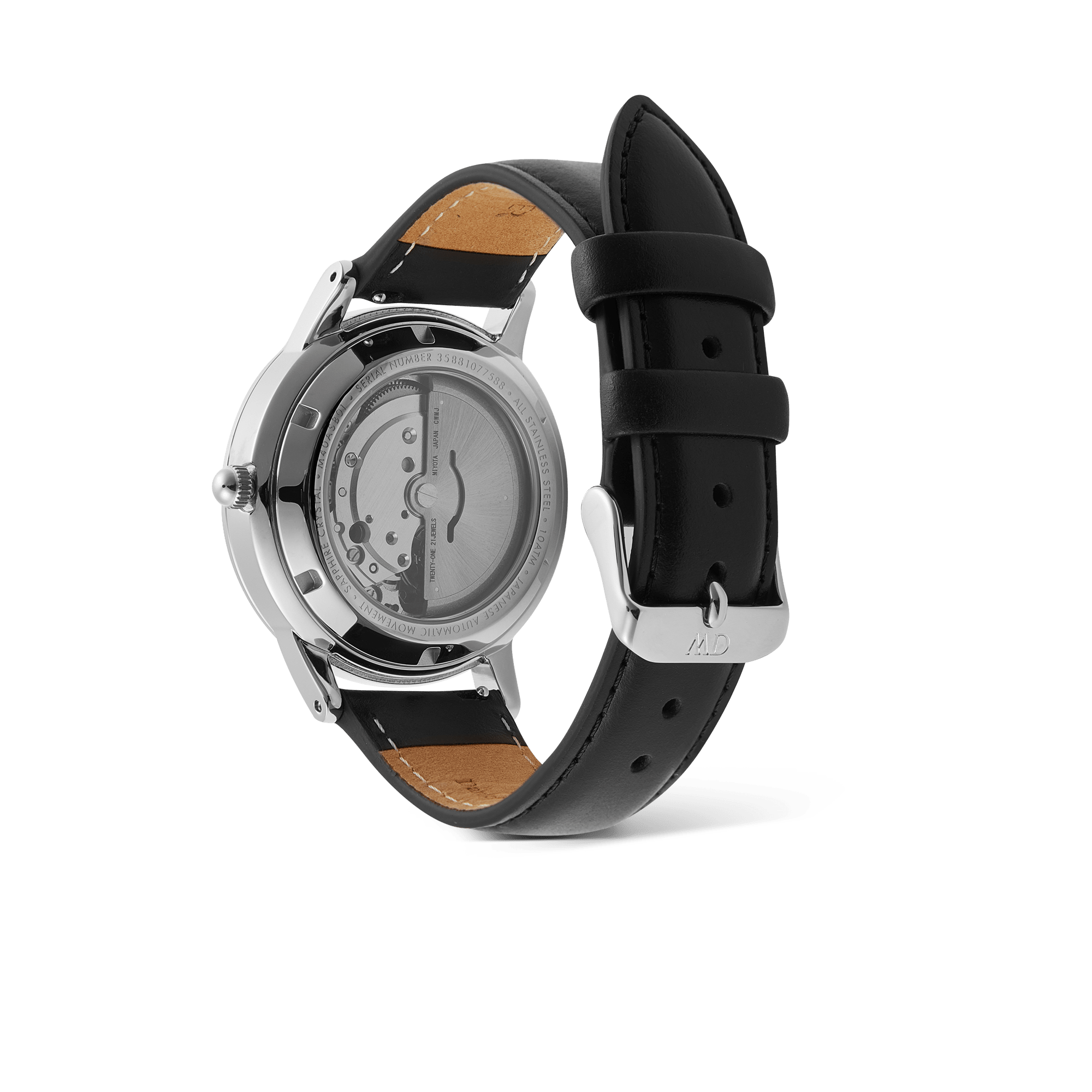 The Iconic Automatic is Daniel Wellington's most advanced timepiece to date, featuring a self-winding movement powered by the motion of your wrist. This version’s emerald green dial has an exclusive enamel finish, delivering a glossy and vivid hue. It boasts glow-in-the-dark index markers and floating hands, a magnified date display, and water-resistance up to 100 meters. The quick release spring bars on the black leather strap make for easy style changes, and there is scratch-resistant sapphire crystal covering the front and back of the silver watch. The exhibition case back exposes the automatic movement inside. A watch designed to get you where you need to be.