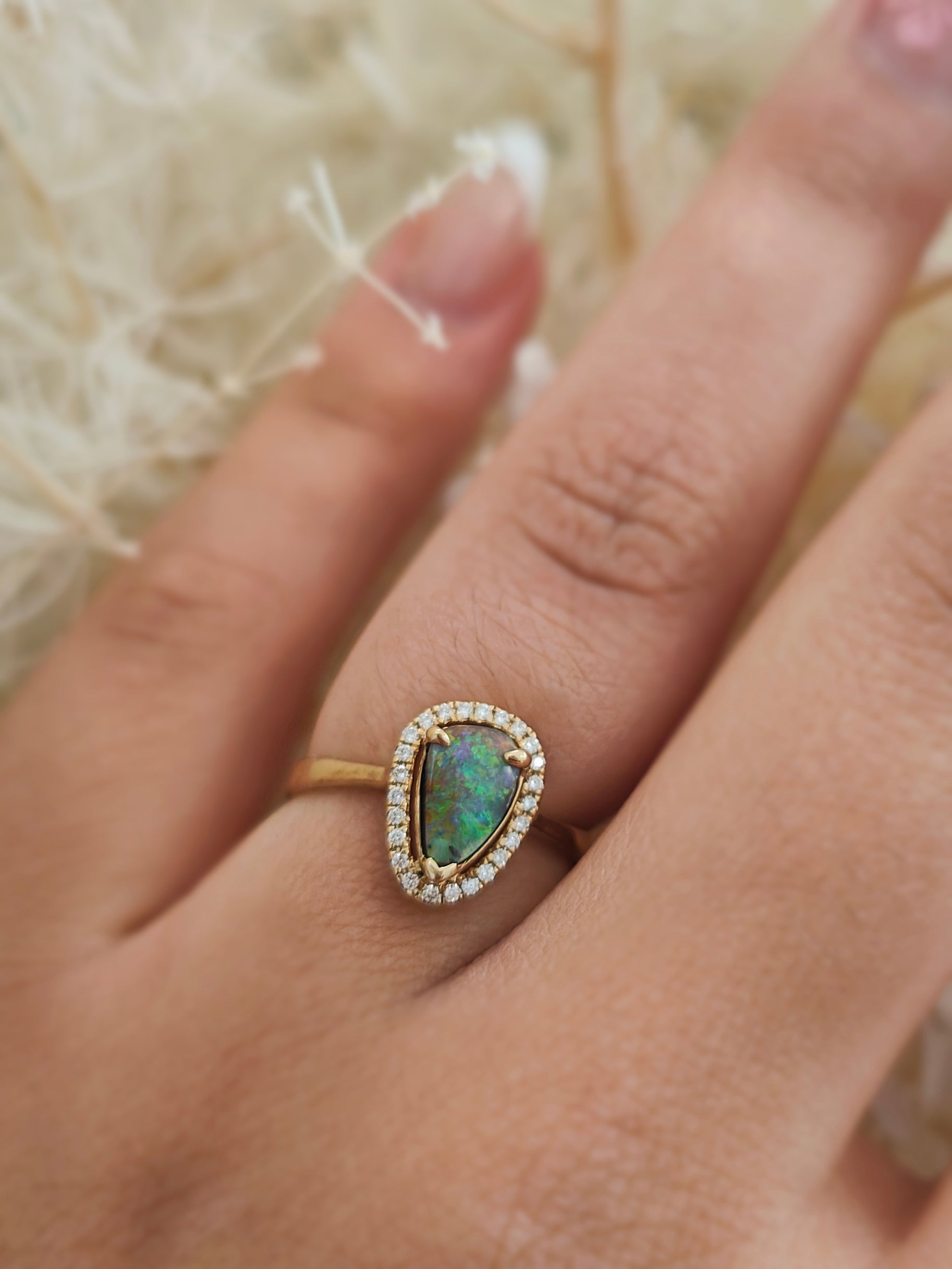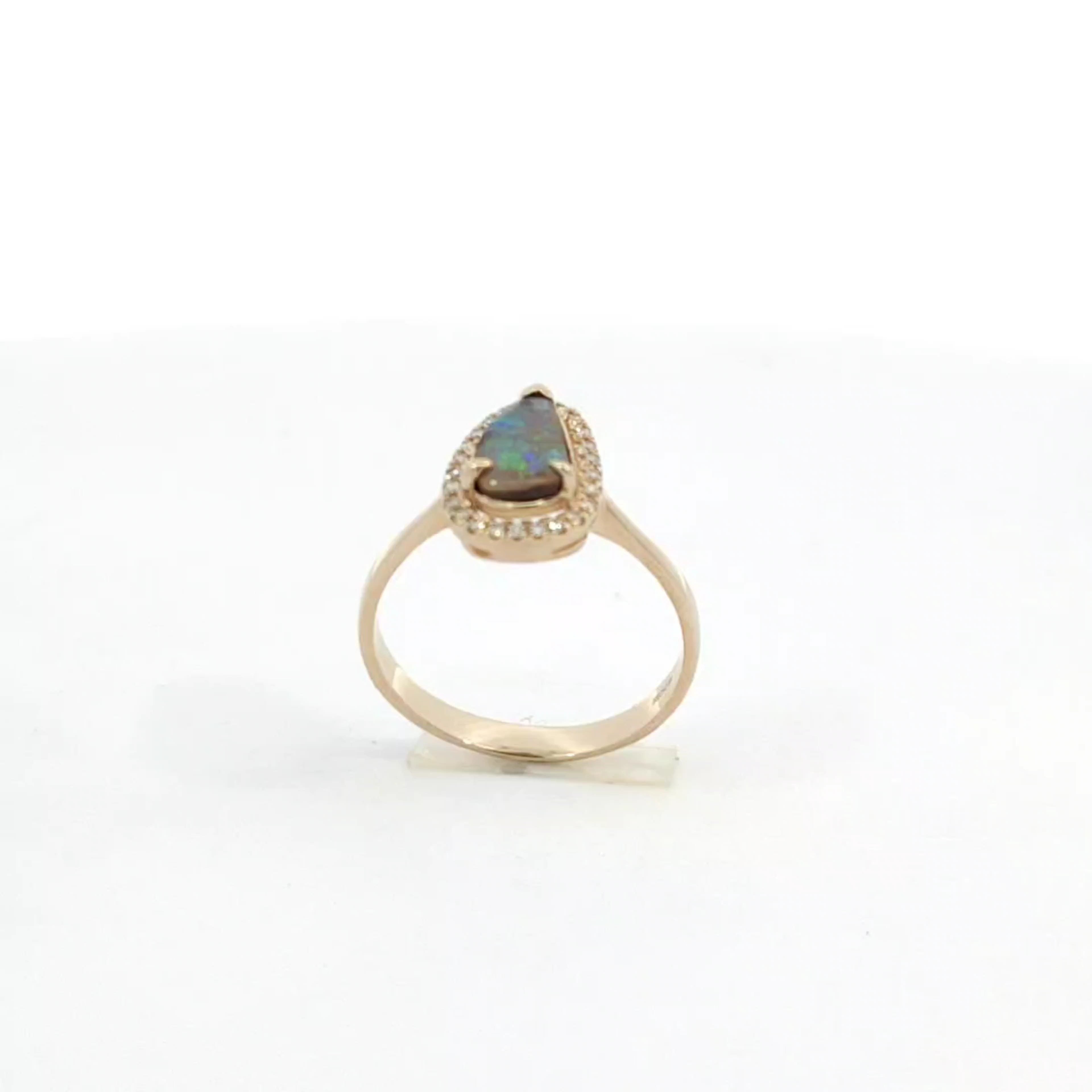 Discover the beauty of this exquisite opal ring, featuring a stunning teardrop-shaped opal at its center. Surrounded by sparkling diamond accents, this piece is perfect for adding a touch of elegance to any outfit. Ideal for special occasions or as a thoughtful gift.
