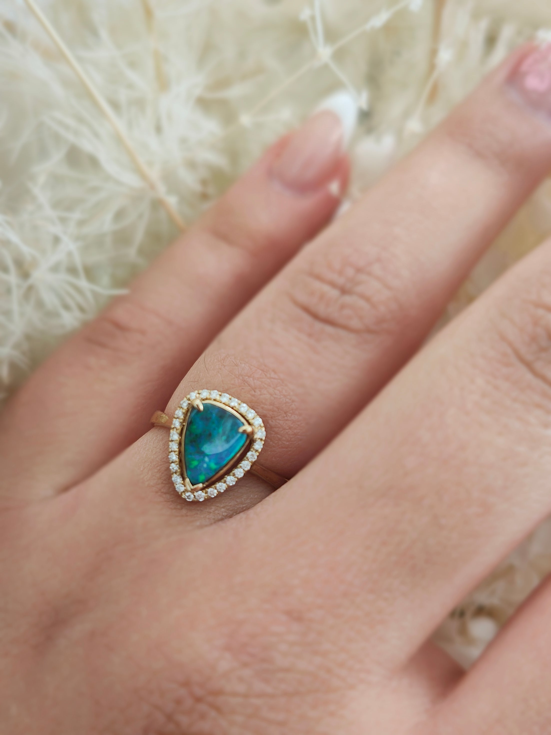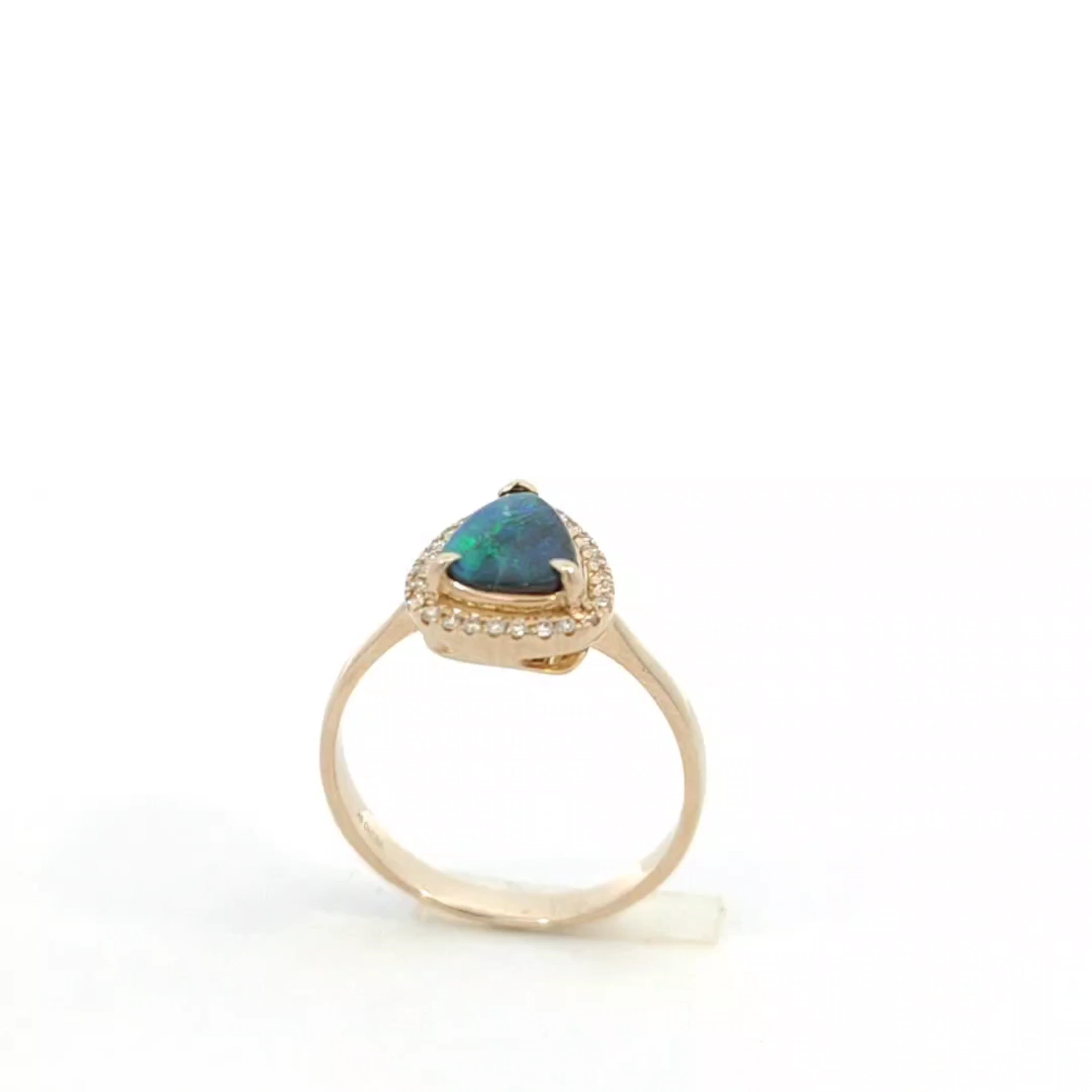 Discover the beauty of this elegant triangular opal ring, designed to captivate and inspire. The stunning opal centerpiece shimmers with vibrant colors, surrounded by a delicate band adorned with sparkling accents. Perfect for any occasion, this ring adds a touch of sophistication to your jewelry collection.