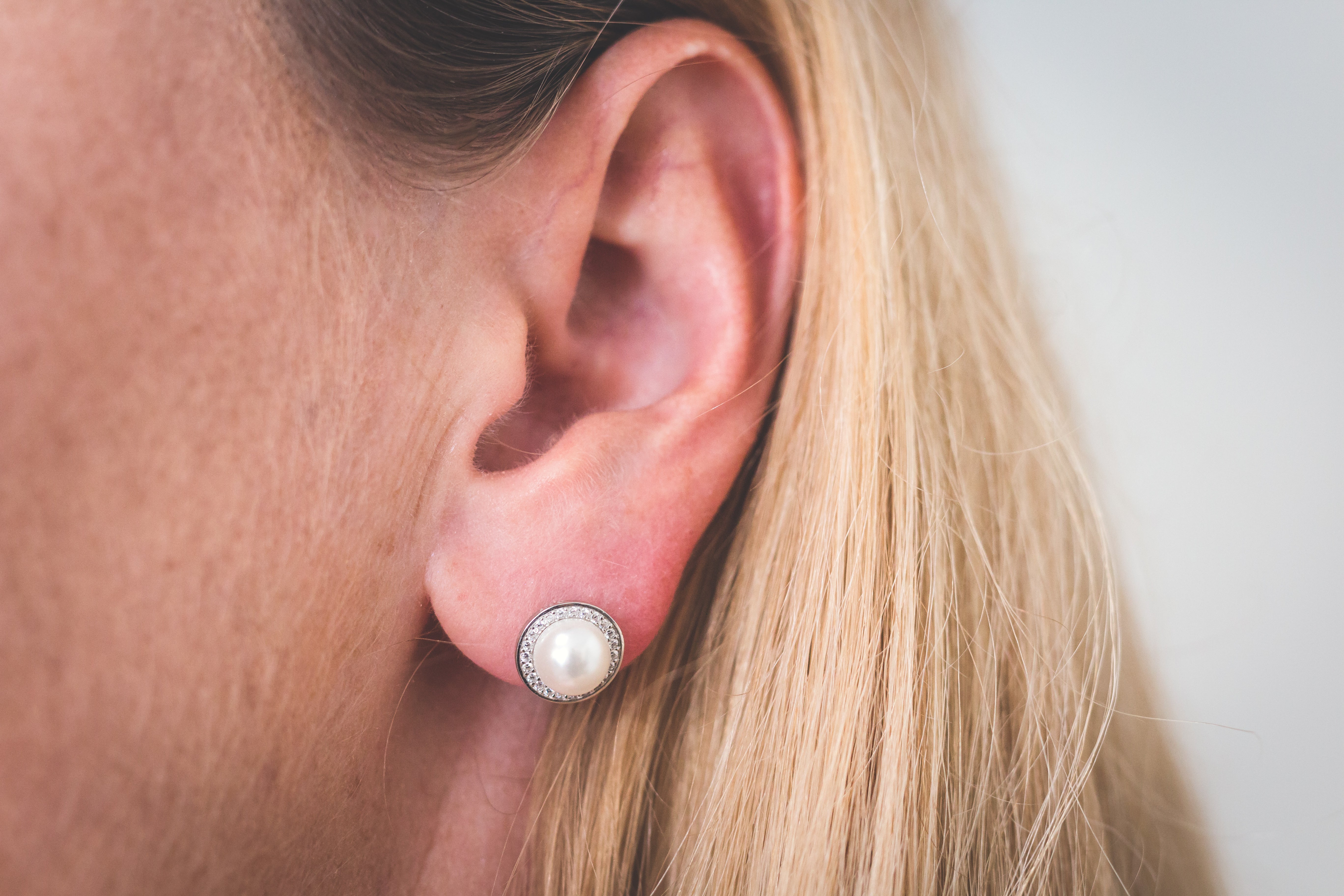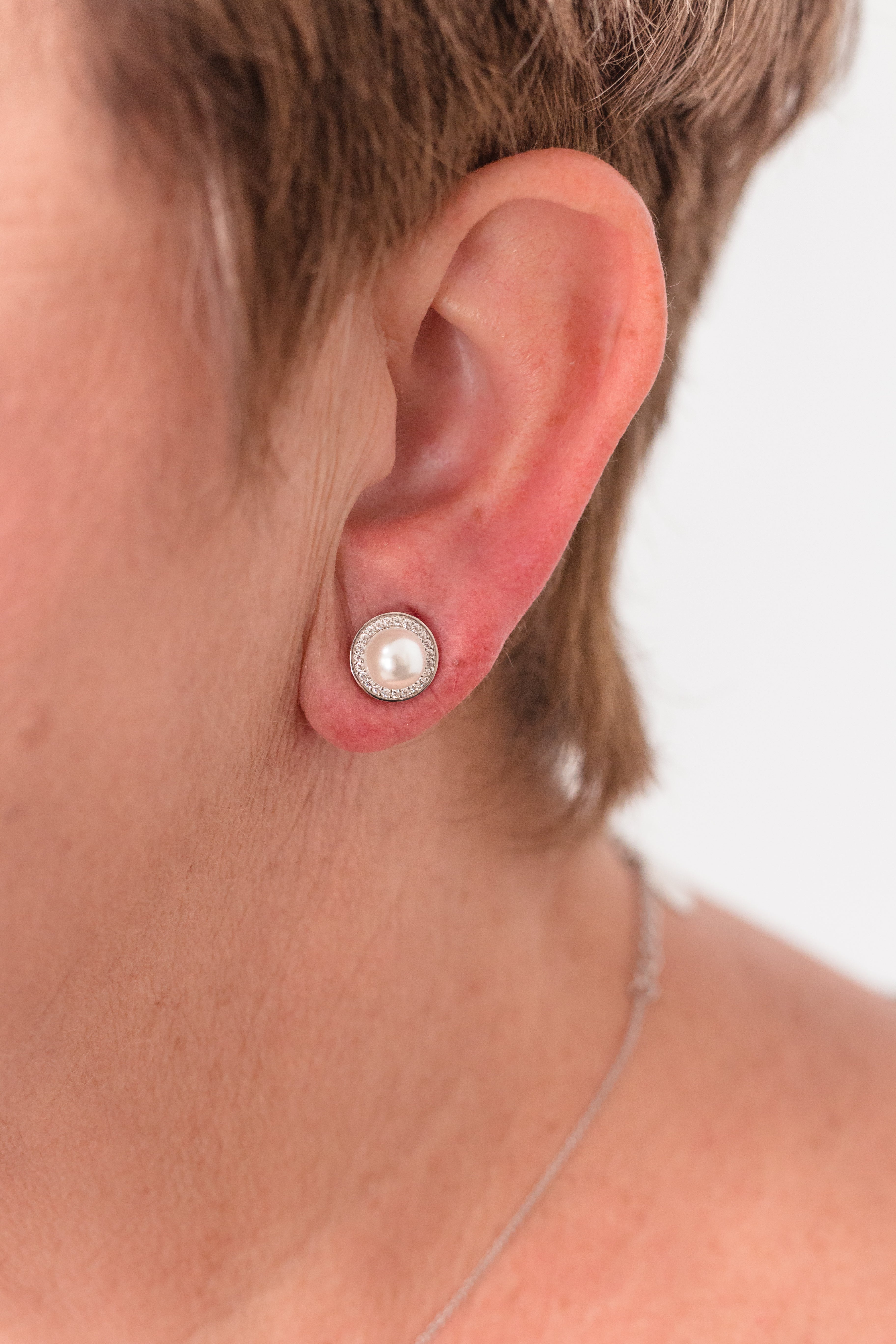 Crafted in 925 sterling silver and Rhodium plated they feature a stunning 7mm Shell-based pearl surrounded by 23 sparkling stones. Approximately 10.74mm wide.