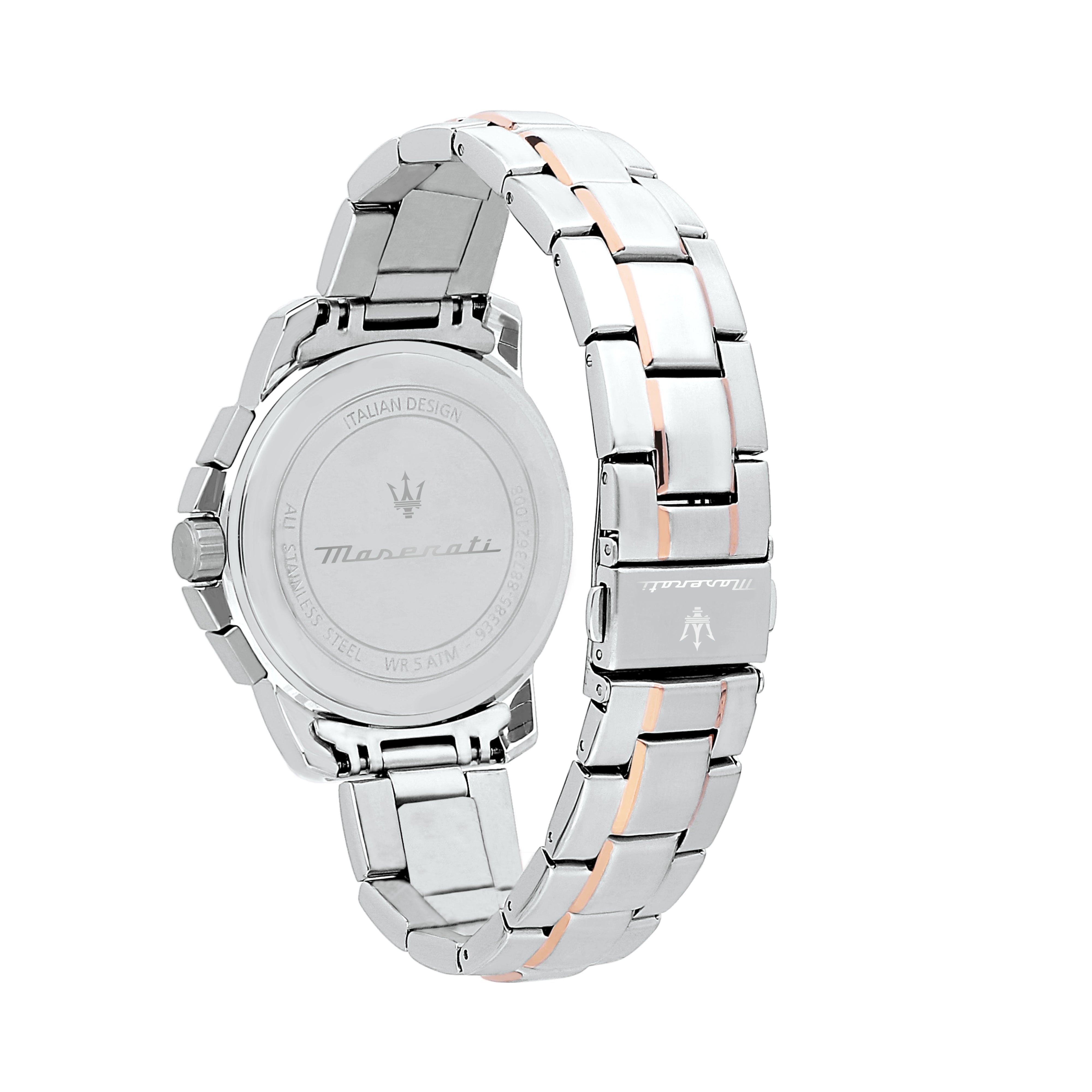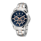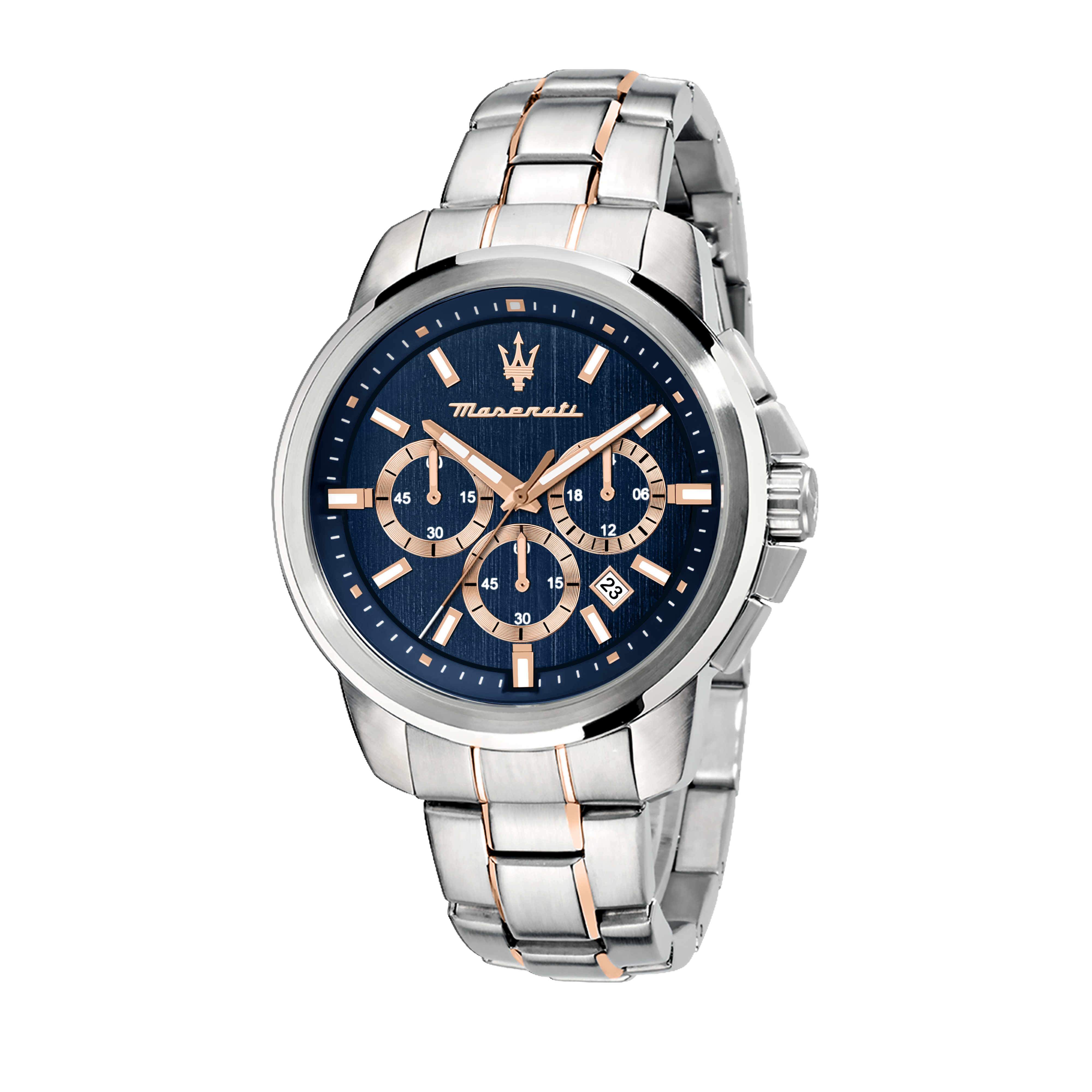 A sporty mood and renovated design for the chronographs of the Successo Collection sets them a class apart. Presenting the Maserati Successo 44mm Navy Blue Chronograph, a sports watch for the elite. A sports collection and in step with the times. Bracelets with simple lines combine with dials with complex shapes, which elegantly enrich the models of this collection. The sturdy steel case encloses dials with bright and contrasting details. The dials, with refined colours, are perfectly matched with steel bracelets or stainless steel straps, which alternate in models and shapes. The counters give the models of the Successo Collection a decidedly sporty chic look. Another distinctive detail of all the watches in the collection are the luminous indexes and hands that enrich the dials with light and give an extra touch of sportiness.