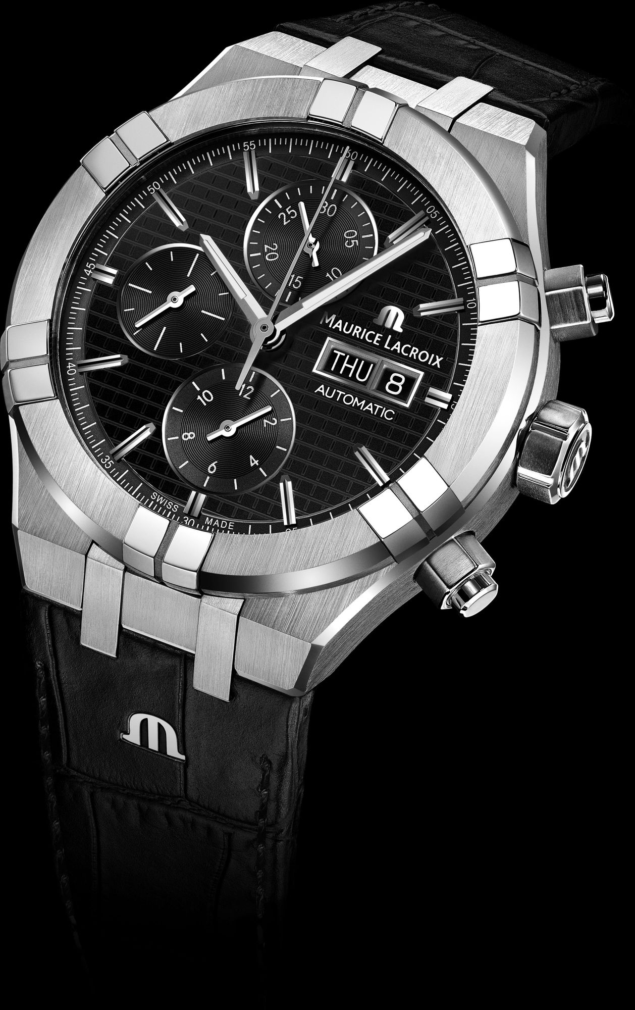 Bracelet/Strap: Black, calf leather strap featuring the Maurice Lacroix 'M' logo