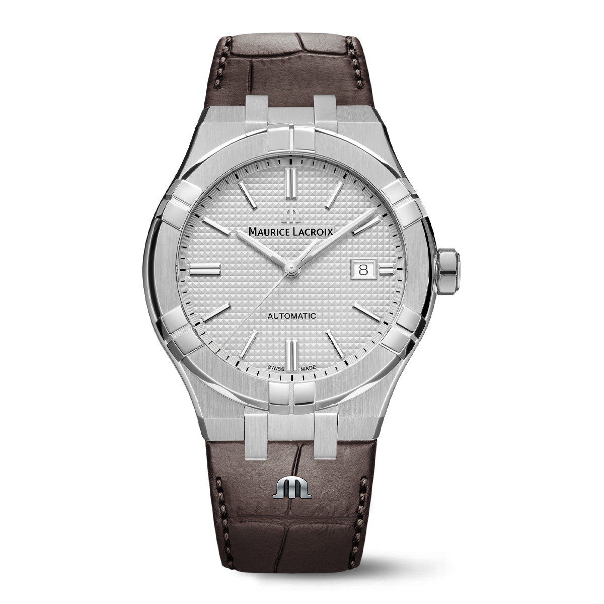 The Maurice Lacroix Aikon Automatic 42mm offers a commanding presence with refined detailing and sophisticated engineering. Its stainless steel case, brushed and polished to perfection, frames a stunning silver dial adorned with a “Clous de Paris” texture — a signature of timeless elegance. Rhodium-plated indexes and Super-LumiNova-filled hands ensure clarity day or night, while the iconic six-claw bezel reinforces the Aikon’s distinct design language. A sapphire crystal case back offers a view into the automatic ML115 caliber, complete with meticulous finishing: Perlage, Colimaçon, and Côtes de Genève on the rotor. Fitted with a rich brown calf leather strap bearing the Maurice Lacroix ‘M’ logo and a stainless steel butterfly buckle, this piece blends luxury and comfort. Water-resistant to 20 ATM and equipped with the Easy Change system, this is a modern classic made for everyday excellence.