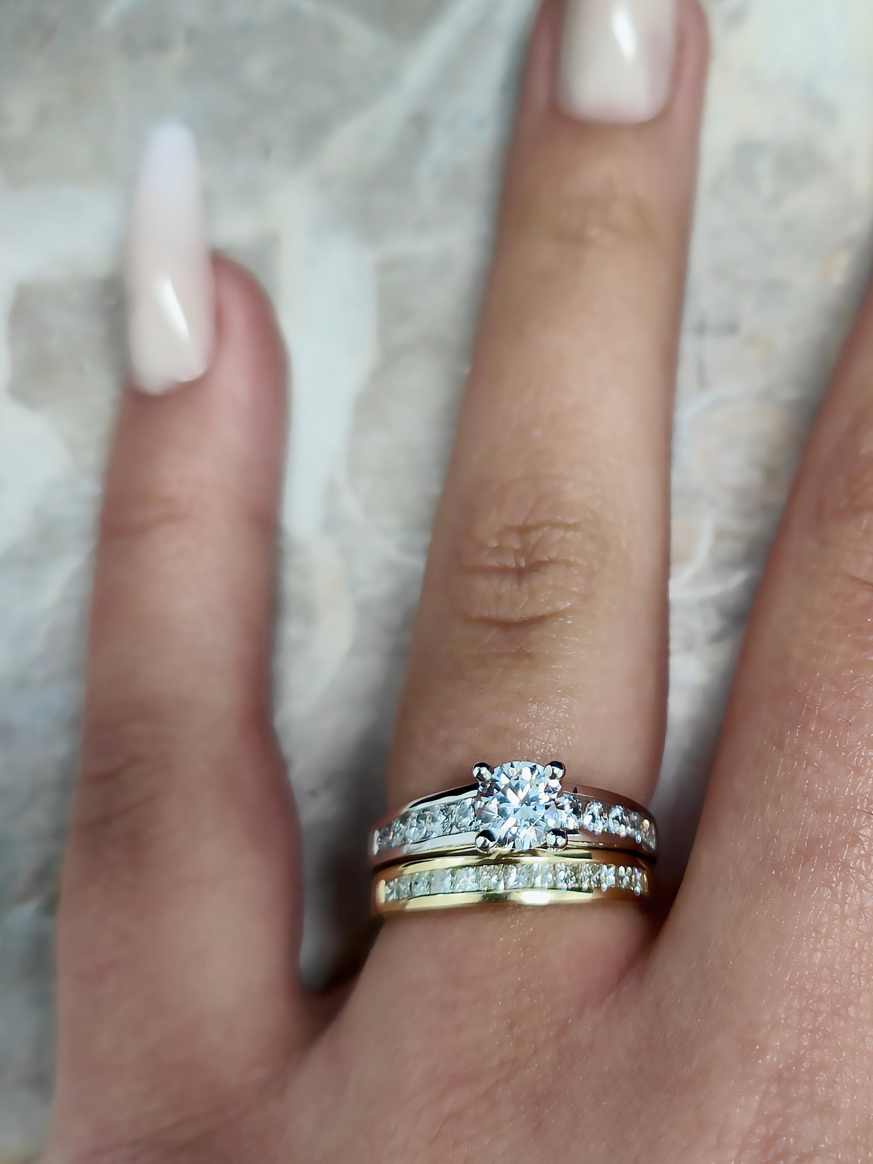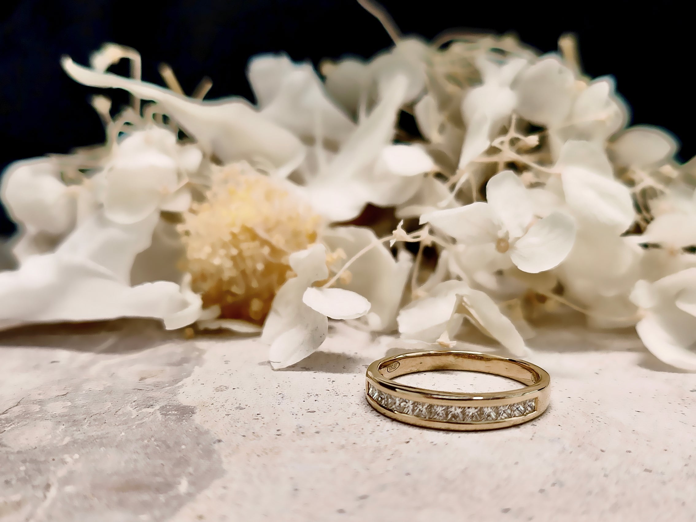 Celebrate eternal love with this exquisite gold and diamond wedding ring, a timeless symbol of devotion and elegance. Crafted from lustrous gold, its sleek band is adorned with dazzling diamonds that catch the light with every movement, radiating brilliance and sophistication. Designed for those who cherish refined beauty, this ring effortlessly combines classic charm with modern allure. Let this breathtaking piece be a sparkling reminder of your forever promise.