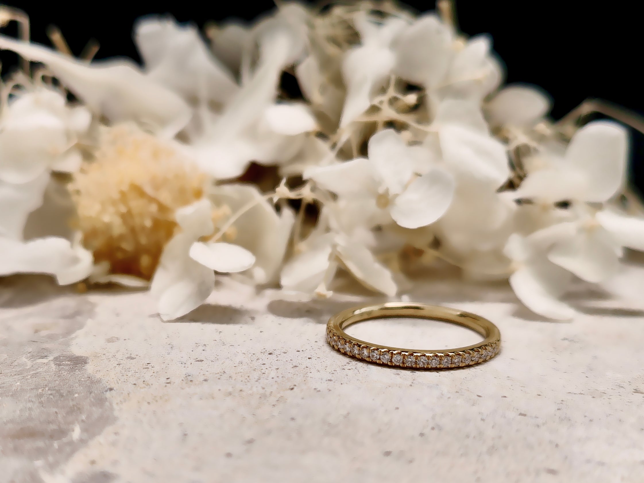 Celebrate eternal love with this exquisite gold and diamond wedding ring, a timeless symbol of devotion and elegance. Crafted from lustrous gold, its sleek band is adorned with dazzling diamonds that catch the light with every movement, radiating brilliance and sophistication. Designed for those who cherish refined beauty, this ring effortlessly combines classic charm with modern allure. Let this breathtaking piece be a sparkling reminder of your forever promise.