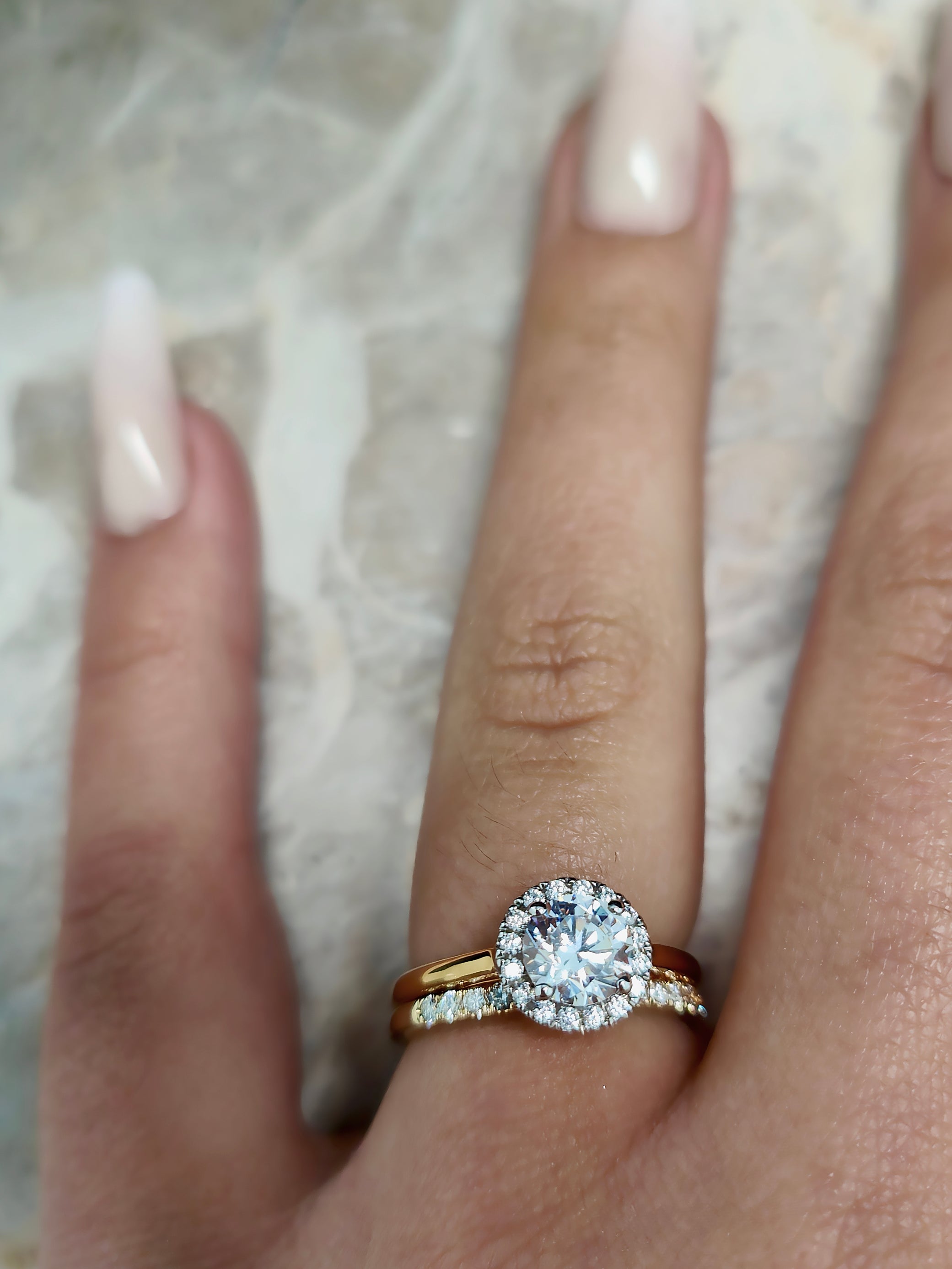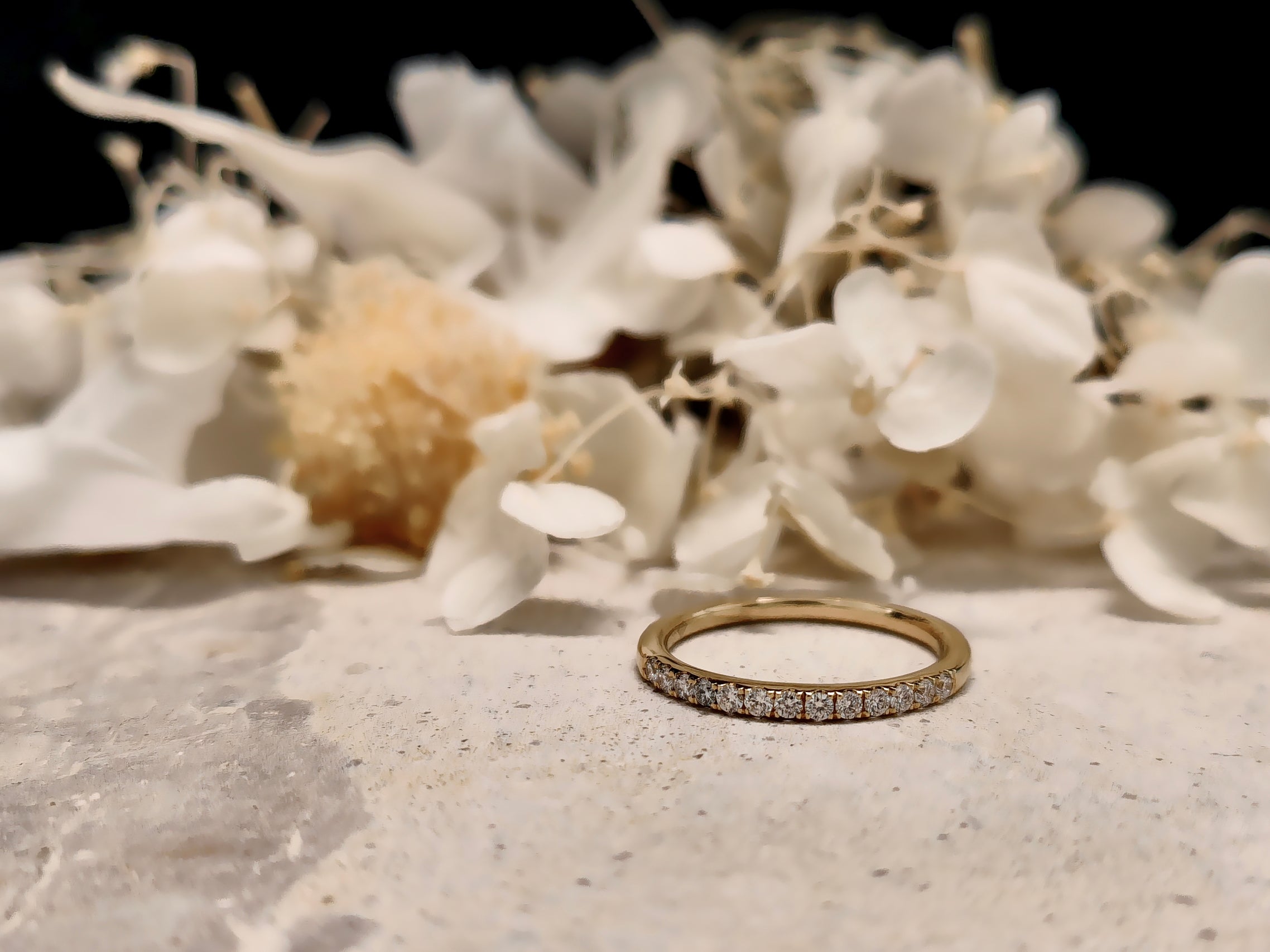 Celebrate eternal love with this exquisite gold and diamond wedding ring, a timeless symbol of devotion and elegance. Crafted from lustrous gold, its sleek band is adorned with dazzling diamonds that catch the light with every movement, radiating brilliance and sophistication. Designed for those who cherish refined beauty, this ring effortlessly combines classic charm with modern allure. Let this breathtaking piece be a sparkling reminder of your forever promise.