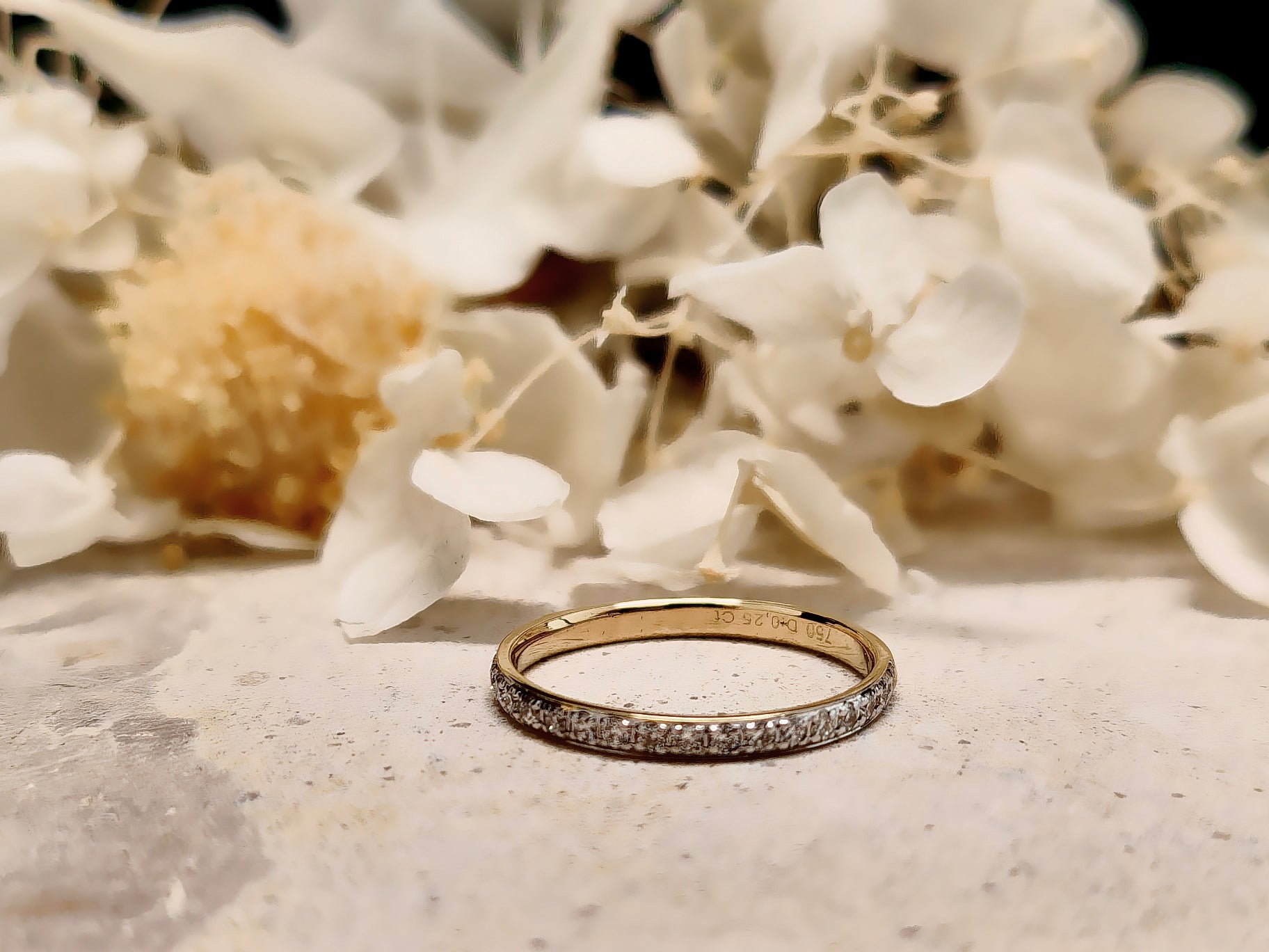 Celebrate eternal love with this exquisite gold and diamond wedding ring, a timeless symbol of devotion and elegance. Crafted from lustrous gold, its sleek band is adorned with dazzling diamonds that catch the light with every movement, radiating brilliance and sophistication. Designed for those who cherish refined beauty, this ring effortlessly combines classic charm with modern allure. Let this breathtaking piece be a sparkling reminder of your forever promise.
