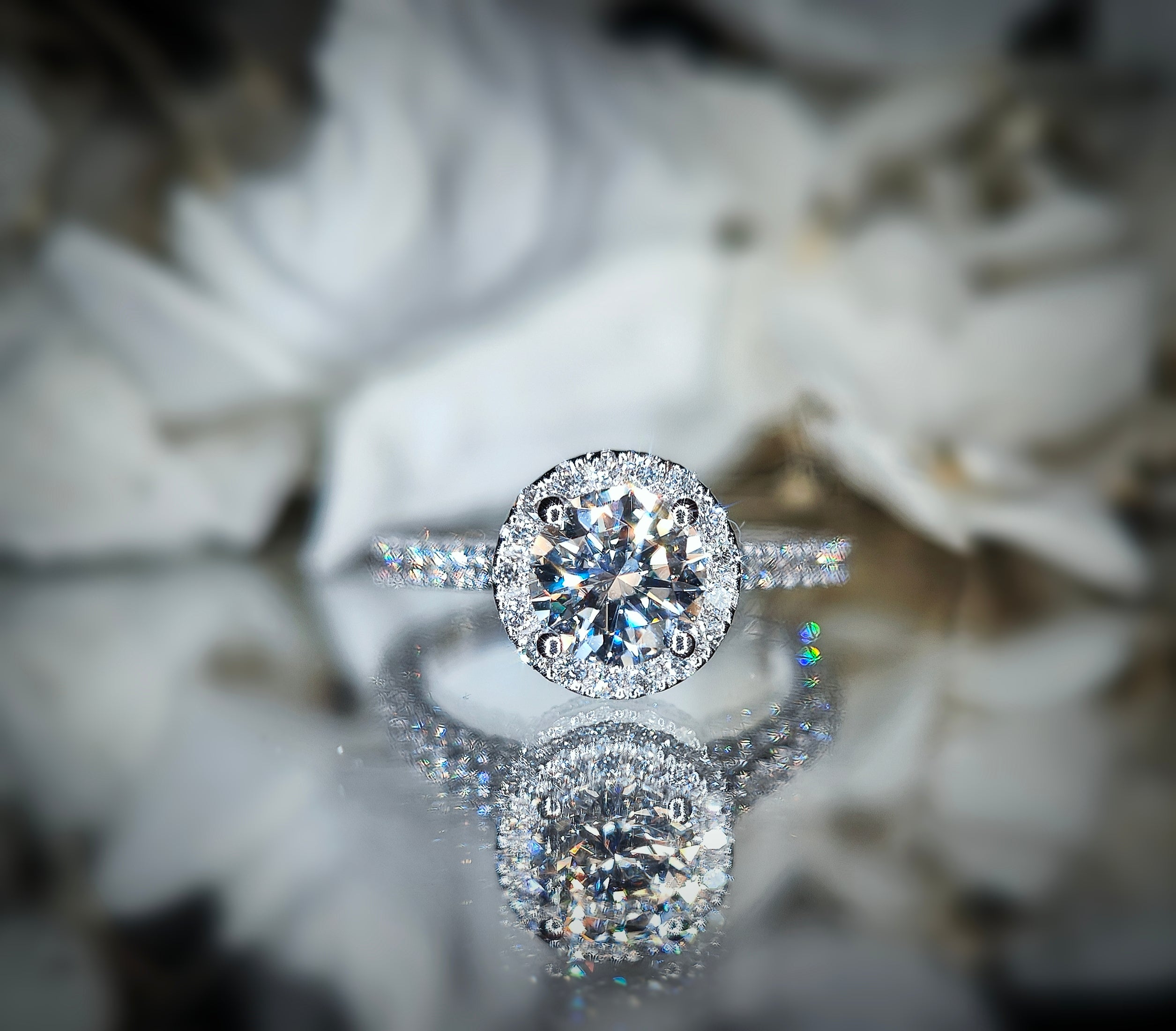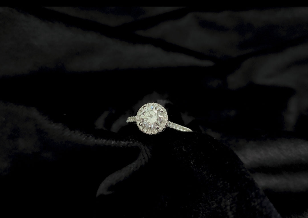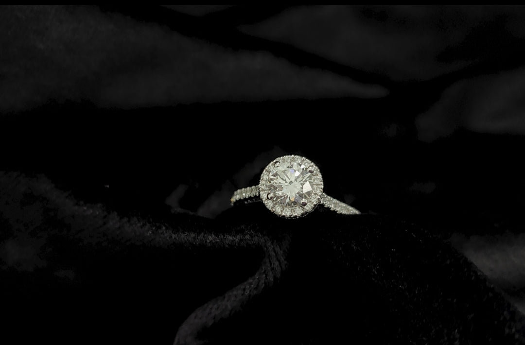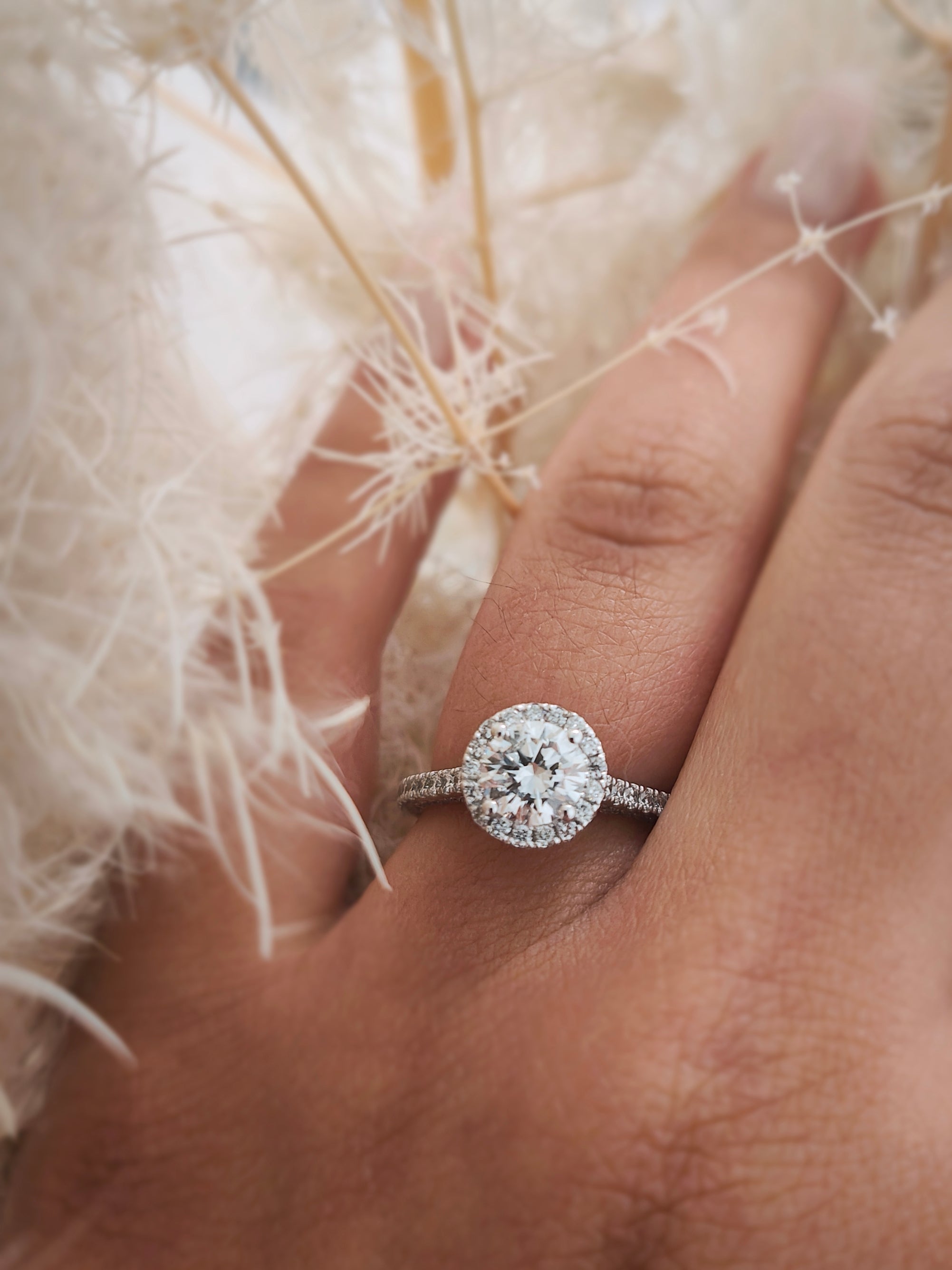 Unleash a symphony of sparkle with the Radiance Burst Ring. A brilliant round diamond explodes with light, surrounded by a halo of dazzling pave diamonds. The delicate, diamond-studded band amplifies the brilliance, creating an unforgettable statement piece. Let the Radiance Burst Ring illuminate your love story with its breathtaking shine.