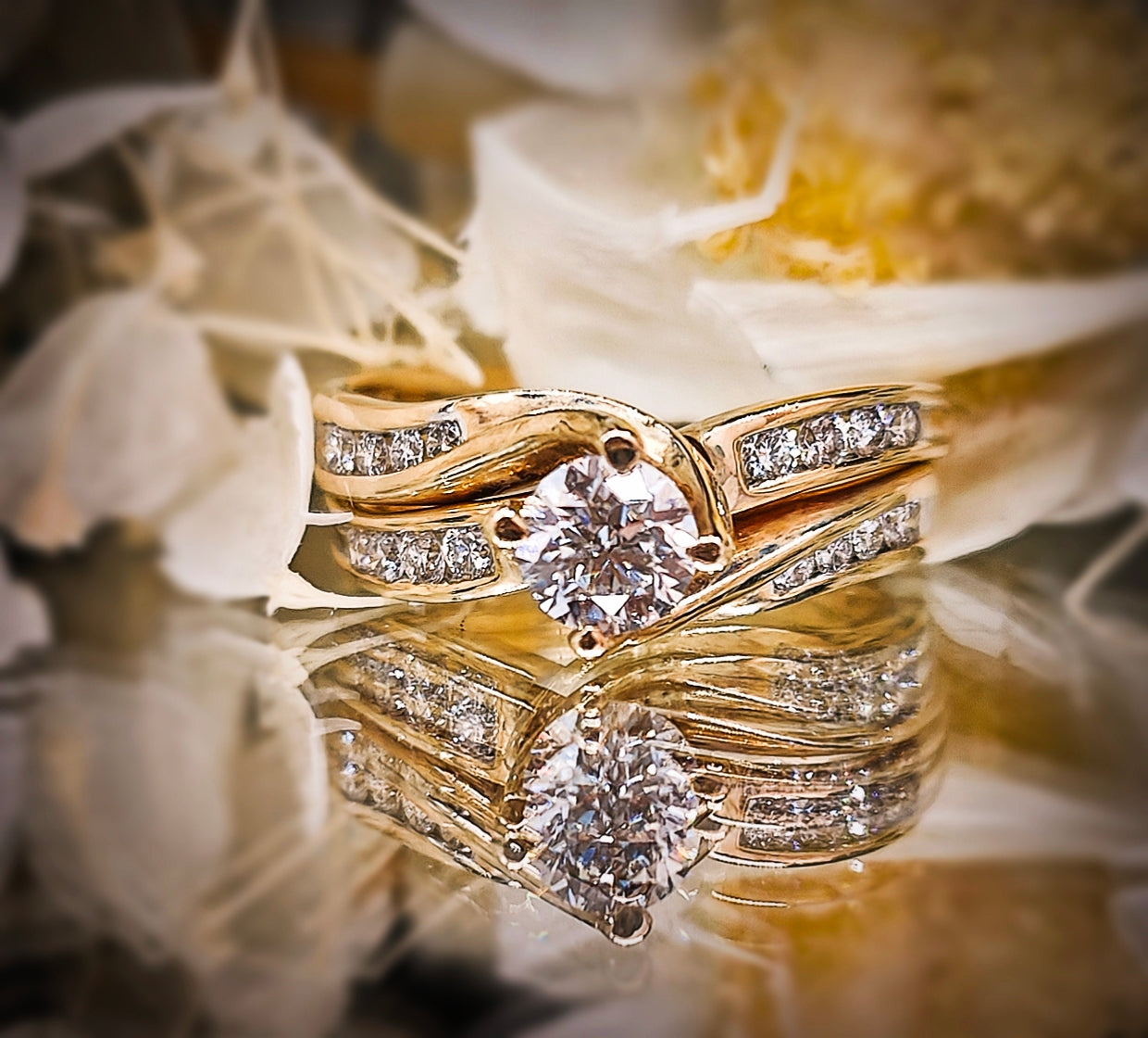 This exquisite yellow gold ring showcases a brilliant round-cut diamond at its center, complemented by a channel-set diamond band for added sparkle. Its classic design and elegant setting make it a perfect symbol of love or a luxurious treat for yourself.