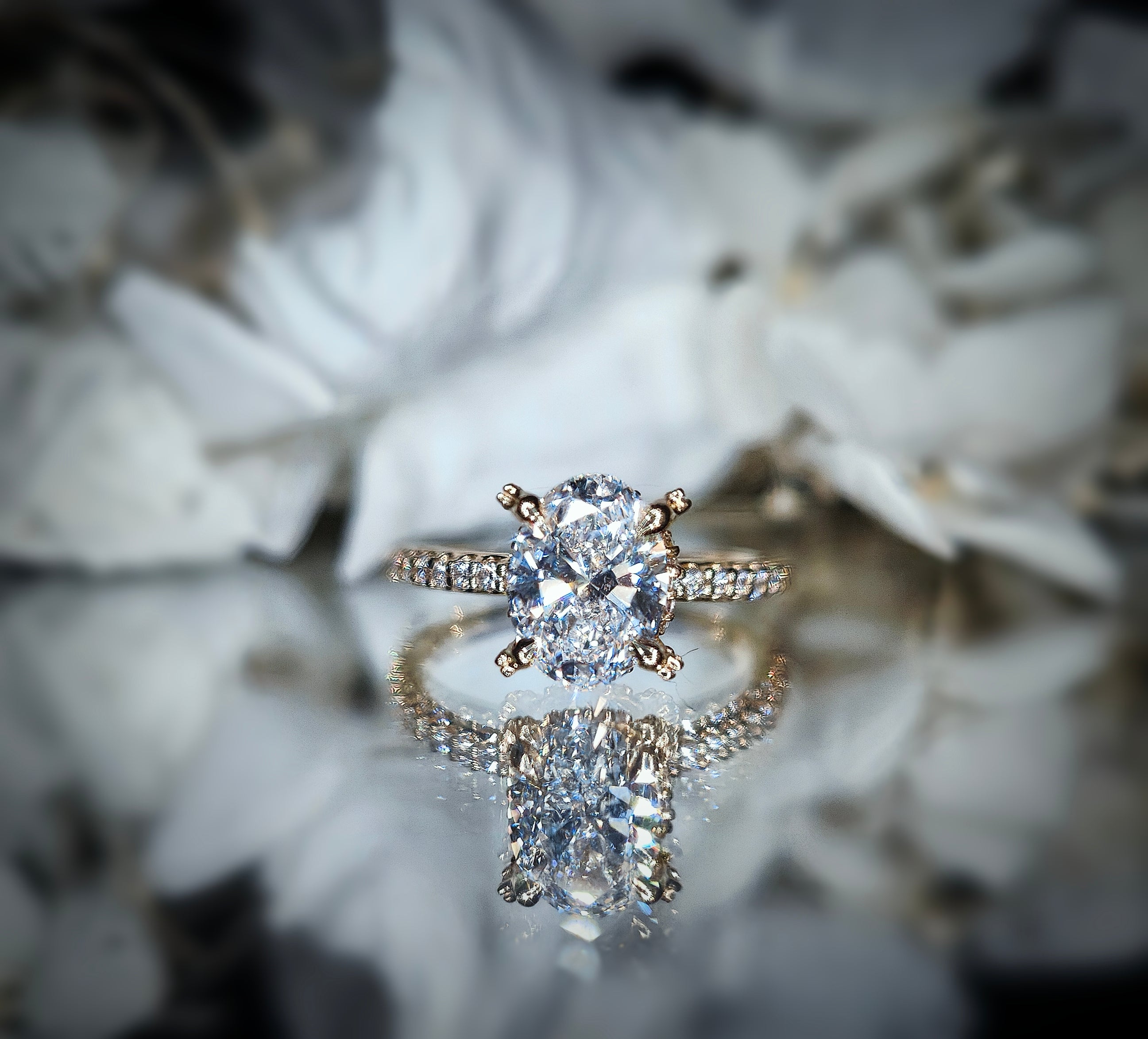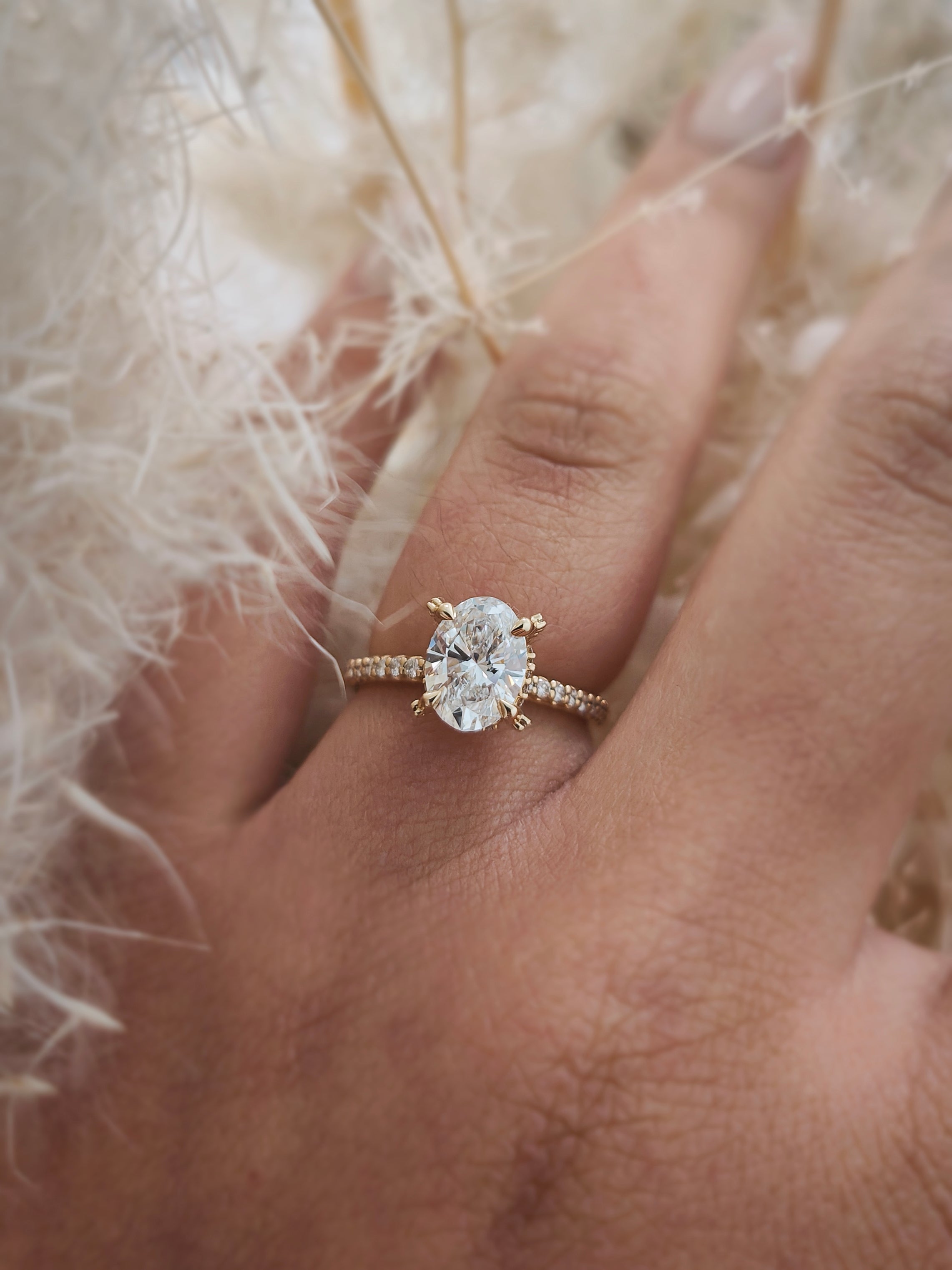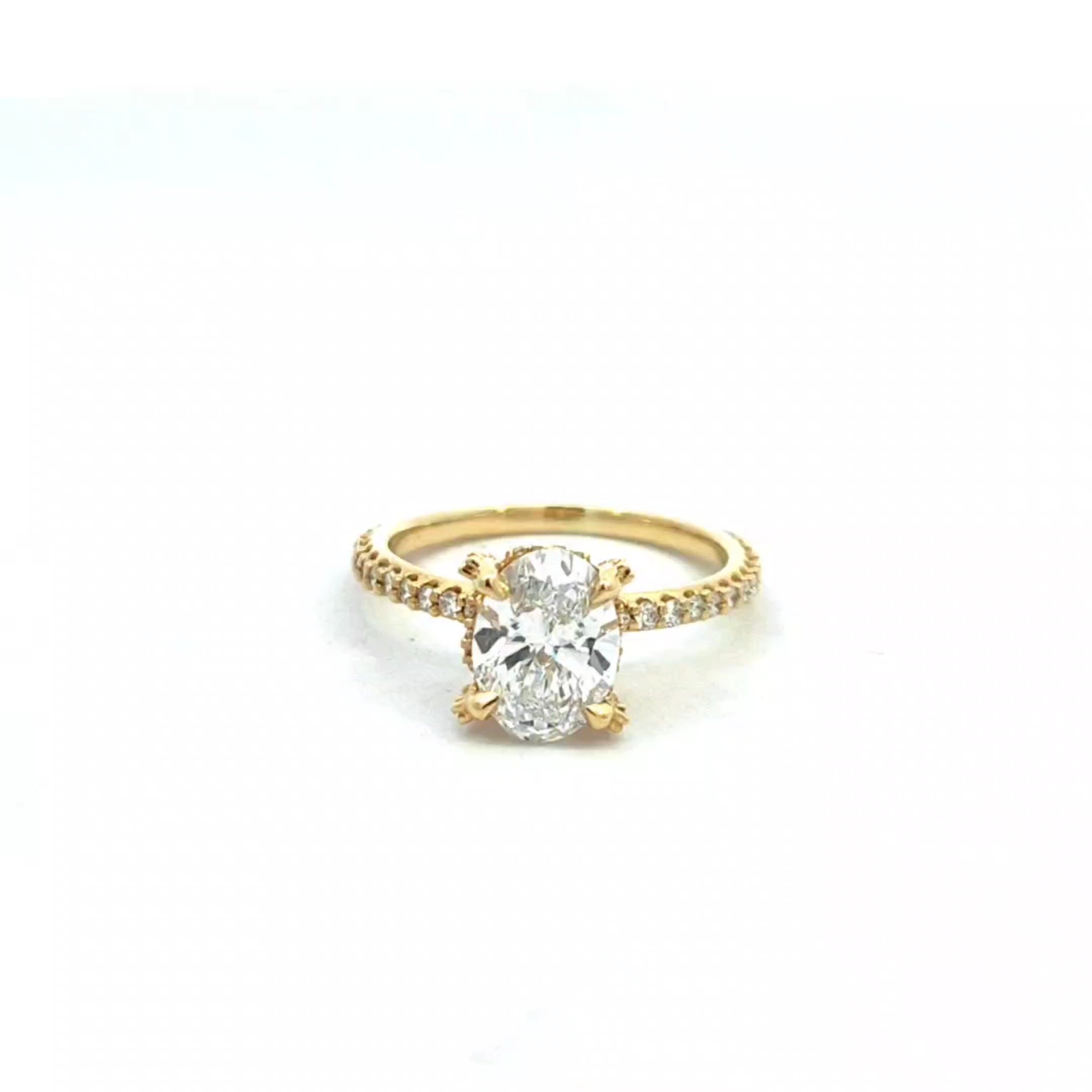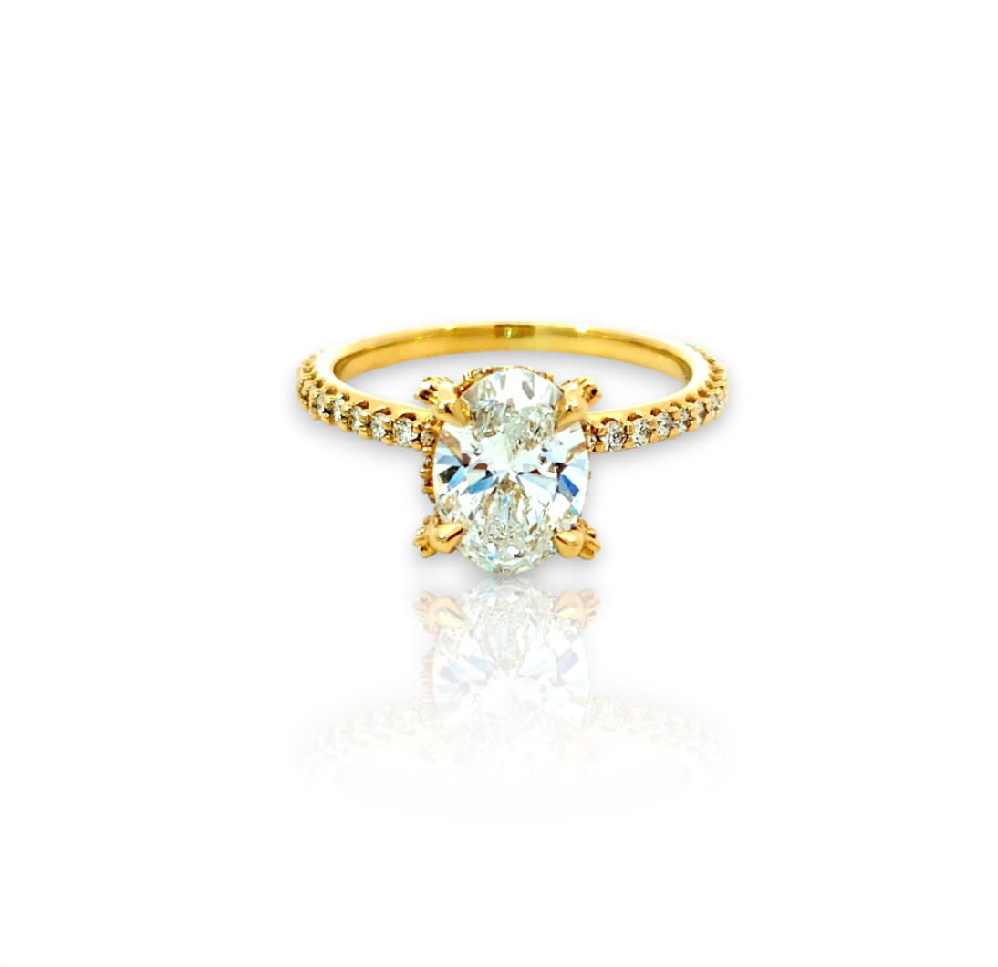 Experience the delicate beauty of the Whisper Bloom Ring. This exquisite ring features a captivating oval-cut diamond, set in a band adorned with a whisper of pave diamonds. The unique, floral-inspired prongs add a touch of romance and intrigue. Let the Whisper Bloom Ring be a symbol of your love's subtle yet undeniable beauty.