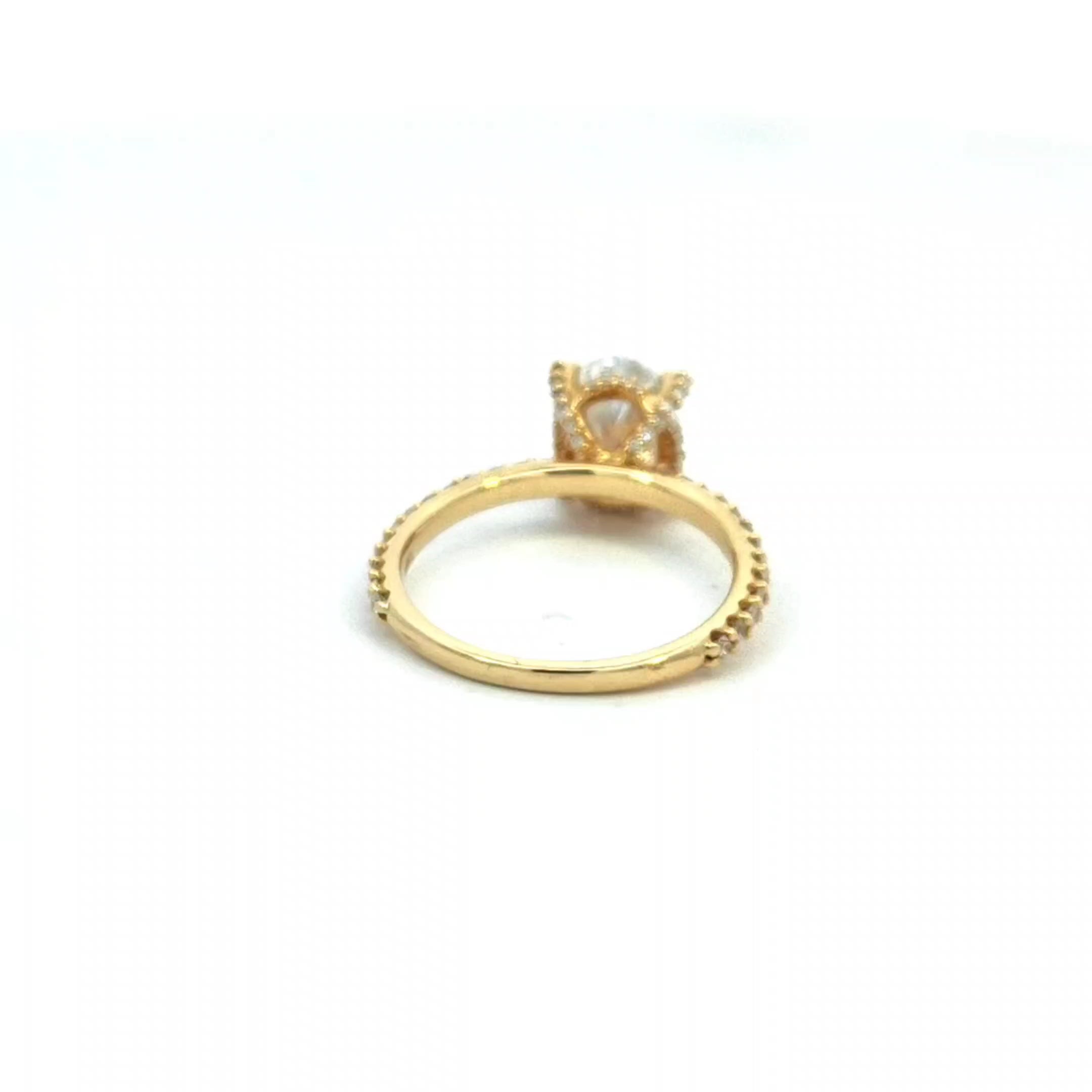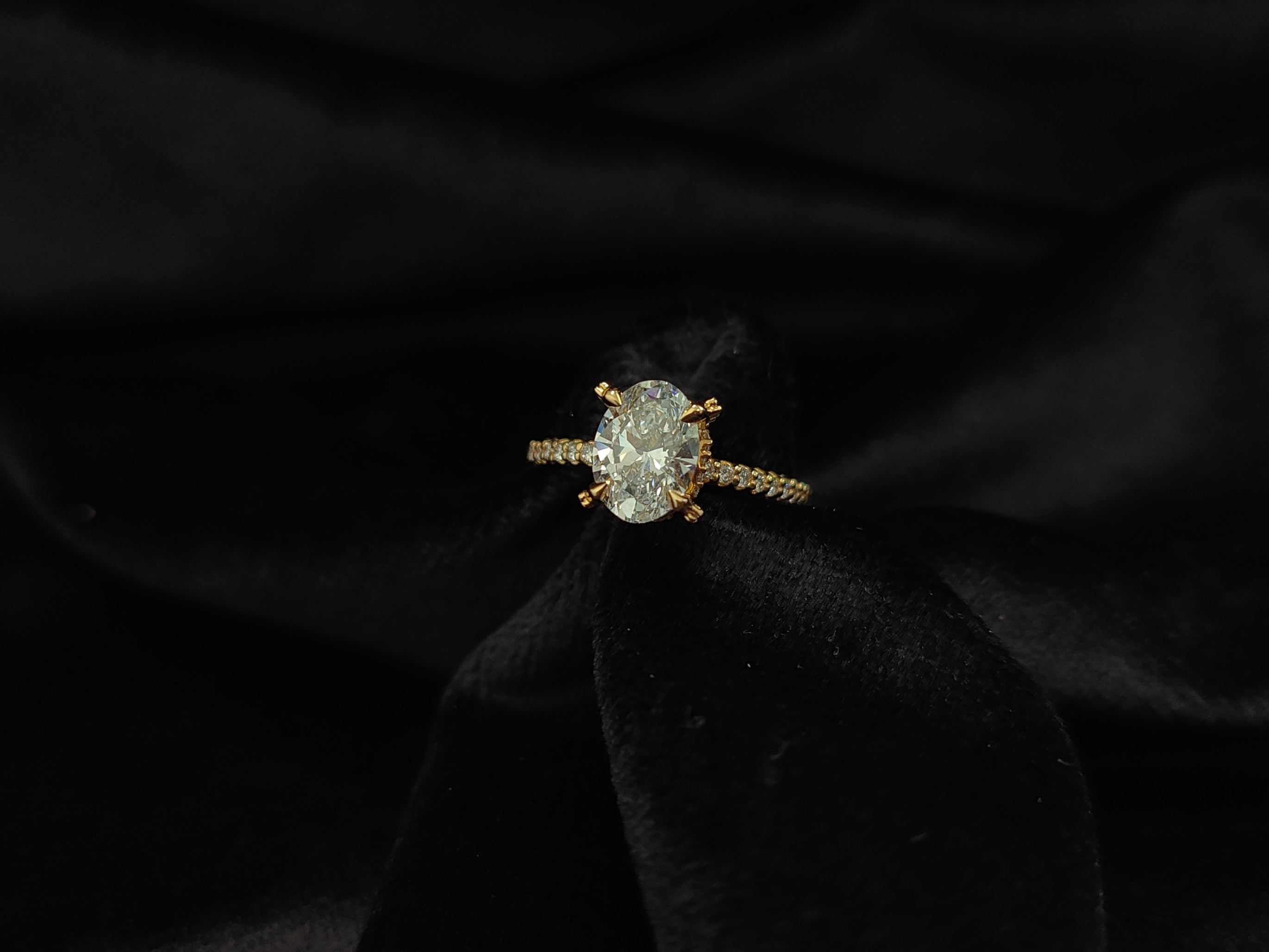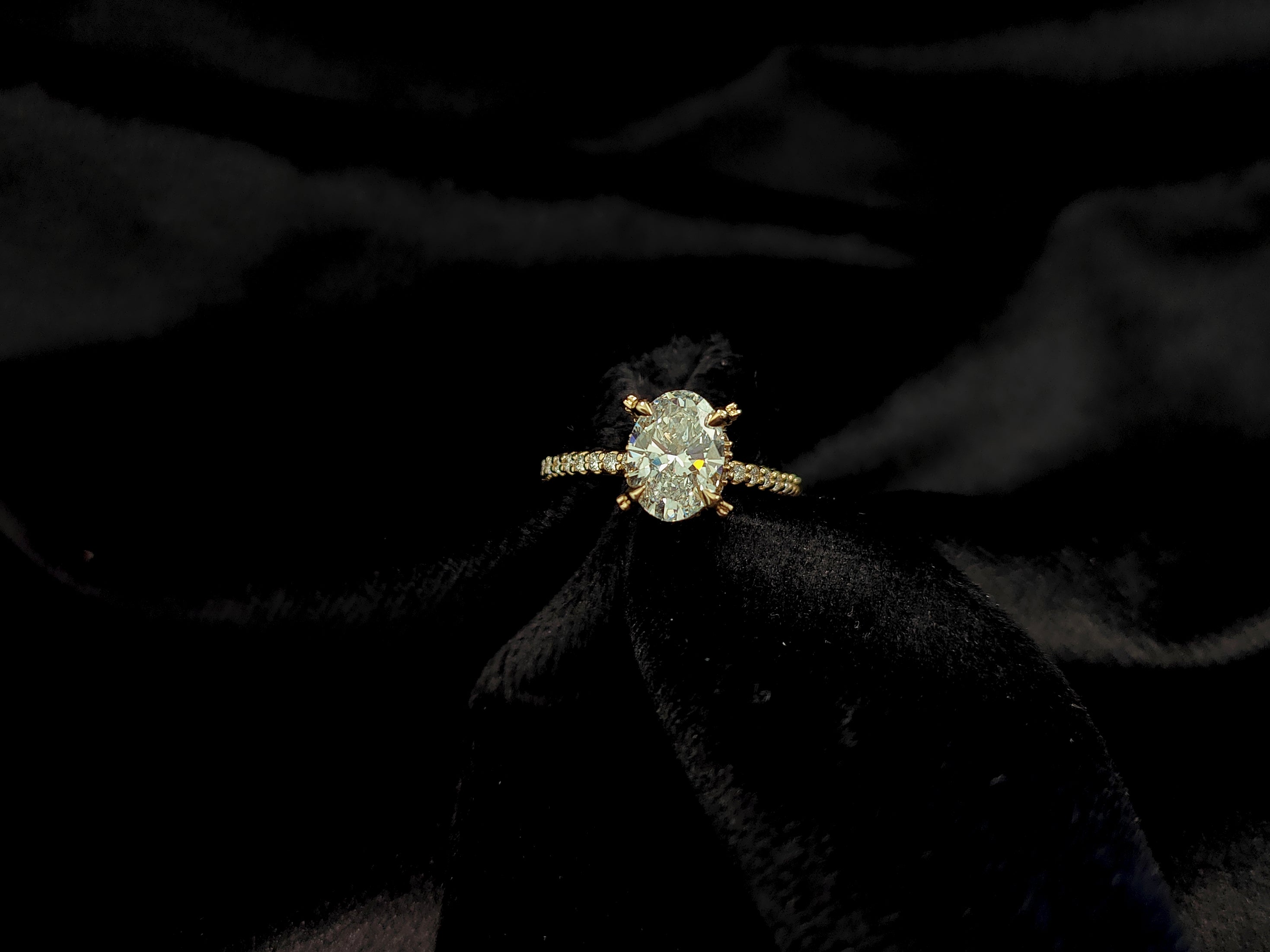 Experience the delicate beauty of the Whisper Bloom Ring. This exquisite ring features a captivating oval-cut diamond, set in a band adorned with a whisper of pave diamonds. The unique, floral-inspired prongs add a touch of romance and intrigue. Let the Whisper Bloom Ring be a symbol of your love's subtle yet undeniable beauty.