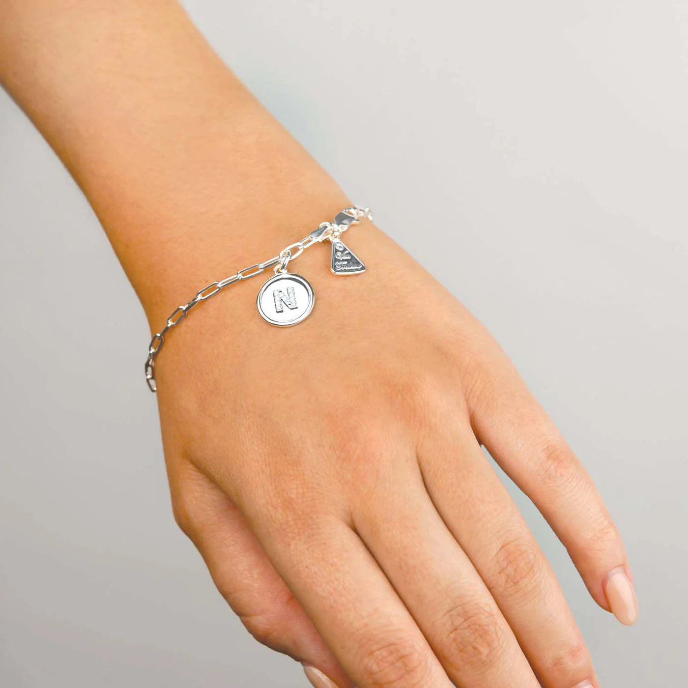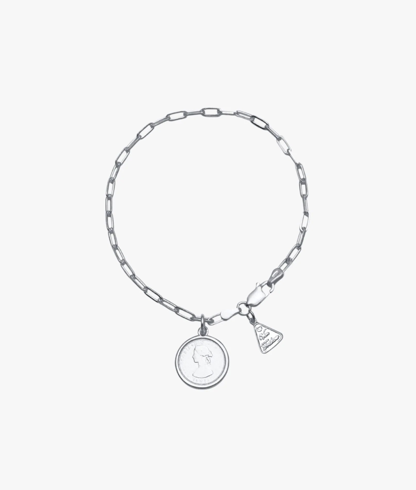 Fine clip chain bracelet with 2-sided coin & initial charm. This unique charm features an Australian token coin image on one side & the initial of your choice on the reverse. The initial is set with cubic zirconia gemstones.